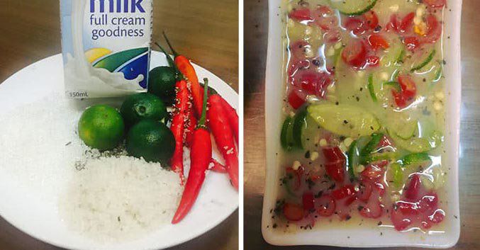 Để làm món nước chấm này rất đơn giản, các bạn chỉ cần chuẩn bị 100g đường, 25g muối hột, 40g bột ngọt, 10g ớt hiểm đỏ, 10g ớt chuông đỏ, 3 lá chanh tươi, 2 thìa sữa đặc và nước cốt 1 quả chanh. Tất cả những nguyên liệu trên, bạn cho toàn bộ hỗn hợp vào máy xay, xay nhuyễn cho tới khi hỗn hợp có dạng đặc sệt là được.