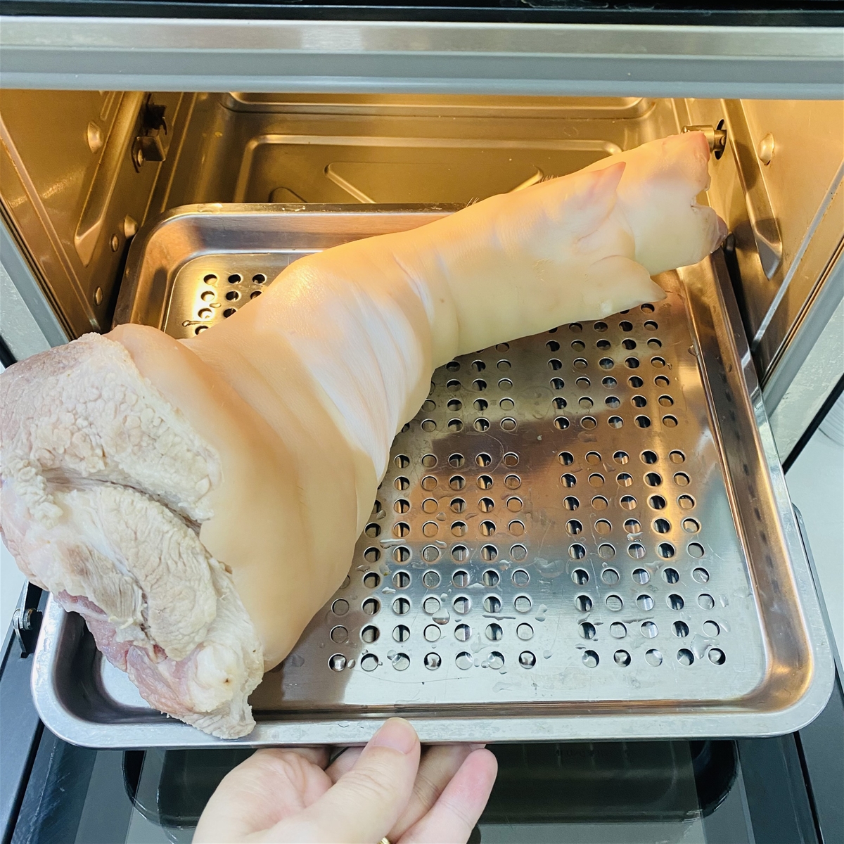 Tiếp theo, các bạn đem chân giò đi hấp. Bạn cho chân giò vào nồi chiên hơi nước Tapuho cài đặt chê độ hấp. Sau khi hấp xong khoảng 30 phút, bạn lấy chân giò ra và dùng tăm tre hoặc cây xiên inox chuyên dụng để đâm lên da chân giò.