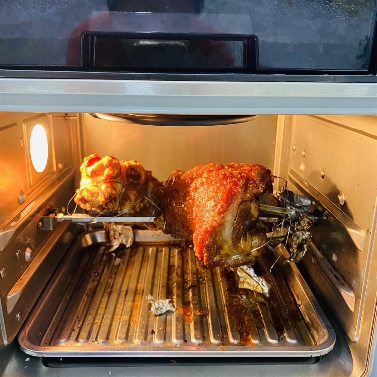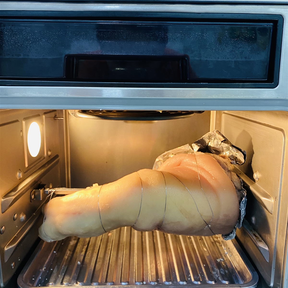 Bạn hãy cho chân giò vào trục quay chuyên dụng. Sau đó bạn cài đặt nhiệt độ ở múc 200 độ C rồi nhấn nút chức năng chiên. Nhờ có sự trợ giúp của trục quay, các bạn sẽ không mất thời gian lật trở. Bạn chỉ cần đợi khoảng 30 phút là chân giò sẽ chín đều, vàng giòn.