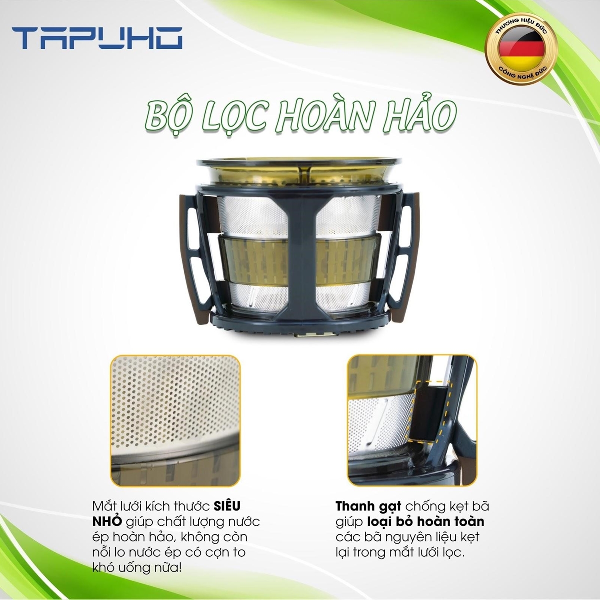 Máy ép chậm Tahupo Sản phẩm ứng dụng công nghệ ép chậm thông minh hiện đại của Đức giúp giải quyết triệt để các vấn đề như: tách nước, ép kiệt đến 98% mà không làm mất đi hương vị hoàn hảo của thực phẩm. Phần lưới lọc kép có mắt lưới cực nhỏ sẽ giúp tạo ra một ly nước ép tinh khiết, thơm ngon.
