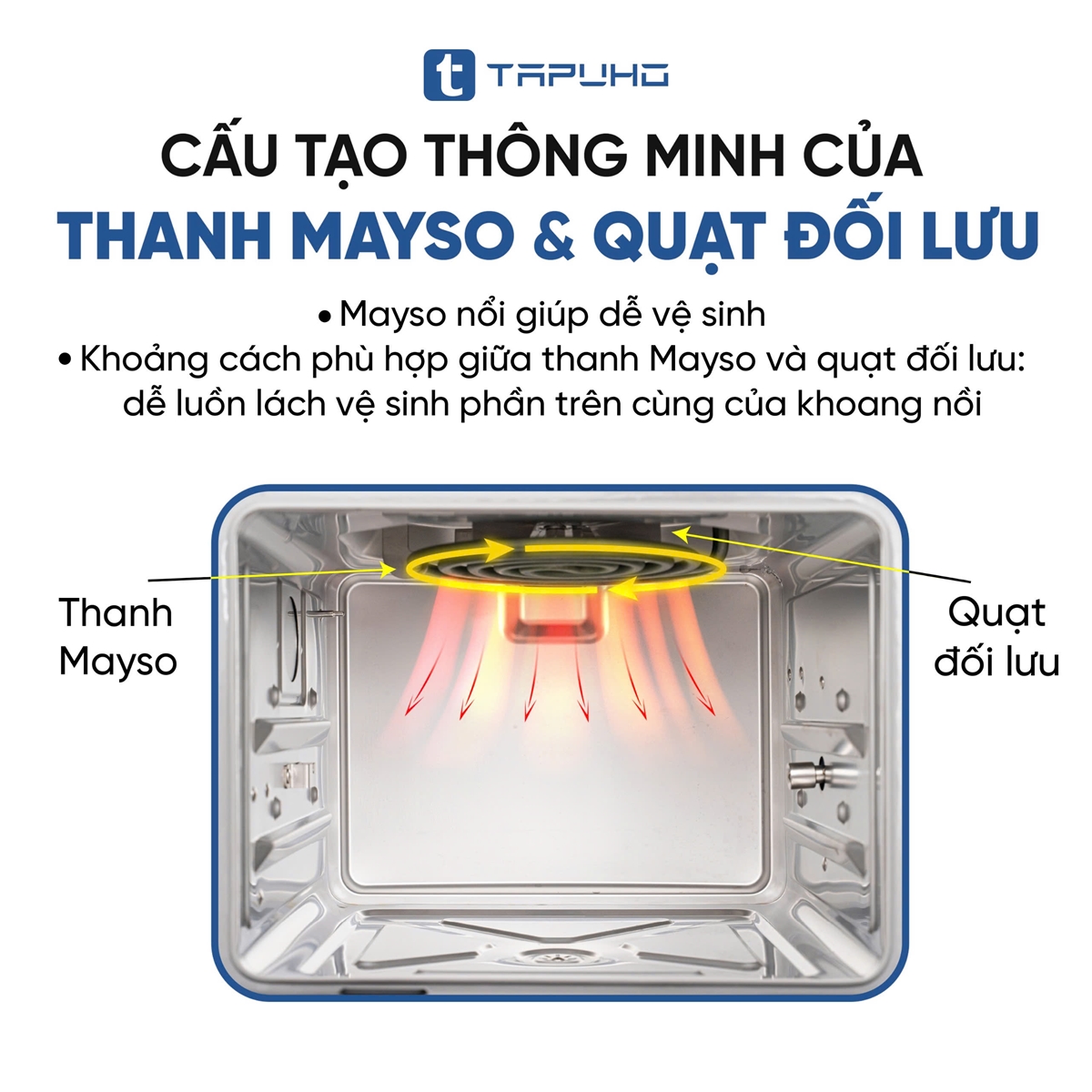 Thấu hiểu điều đó nên ở các dòng nồi chiên hơi nước của TAPUHO như TSF16, TSF16 COLOR đều có thanh mayso trần (không có tấm chắn), giúp người dùng dễ dàng vệ sinh hằng ngày hoặc sau mỗi lần sử dụng. Đặc biệt giữa thanh mayso và quạt đối lưu có một khoảng cách đủ rộng để người dùng có thể dùng khăn ẩm, khéo léo lau các vết bẩn phía trên (đa số các dòng nồi khác có khoảng cách giữa thanh mayso và quạt rất sát nhau, dù không có tấm chắn thì người dùng cũng không có cách nào vệ sinh phía trên cùng của nồi).