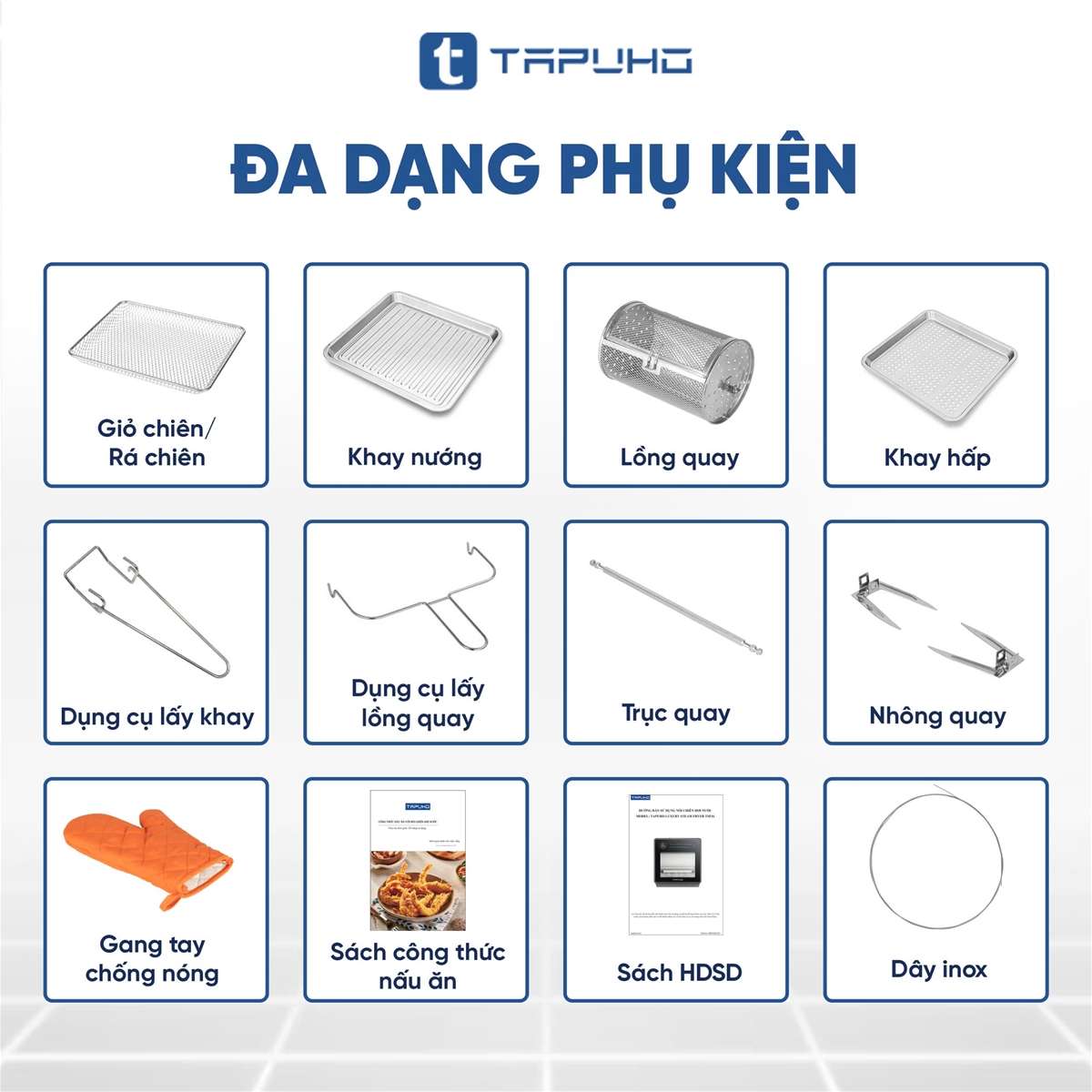 Khi chọn mua nồi chiên hơi nước phiên bản giới hạn TAPUHO LUXURY STEAM FRYER TSF16 COLOR, bạn sẽ được sở hữu trọn bộ sản phẩm nồi chiên hơi nước cùng với những phụ kiện hỗ trợ nấu ăn đa dạng bậc nhất thị trường cùng với chất liệu cao cấp, an toàn cho sức khỏe người dùng, cụ thể như sau