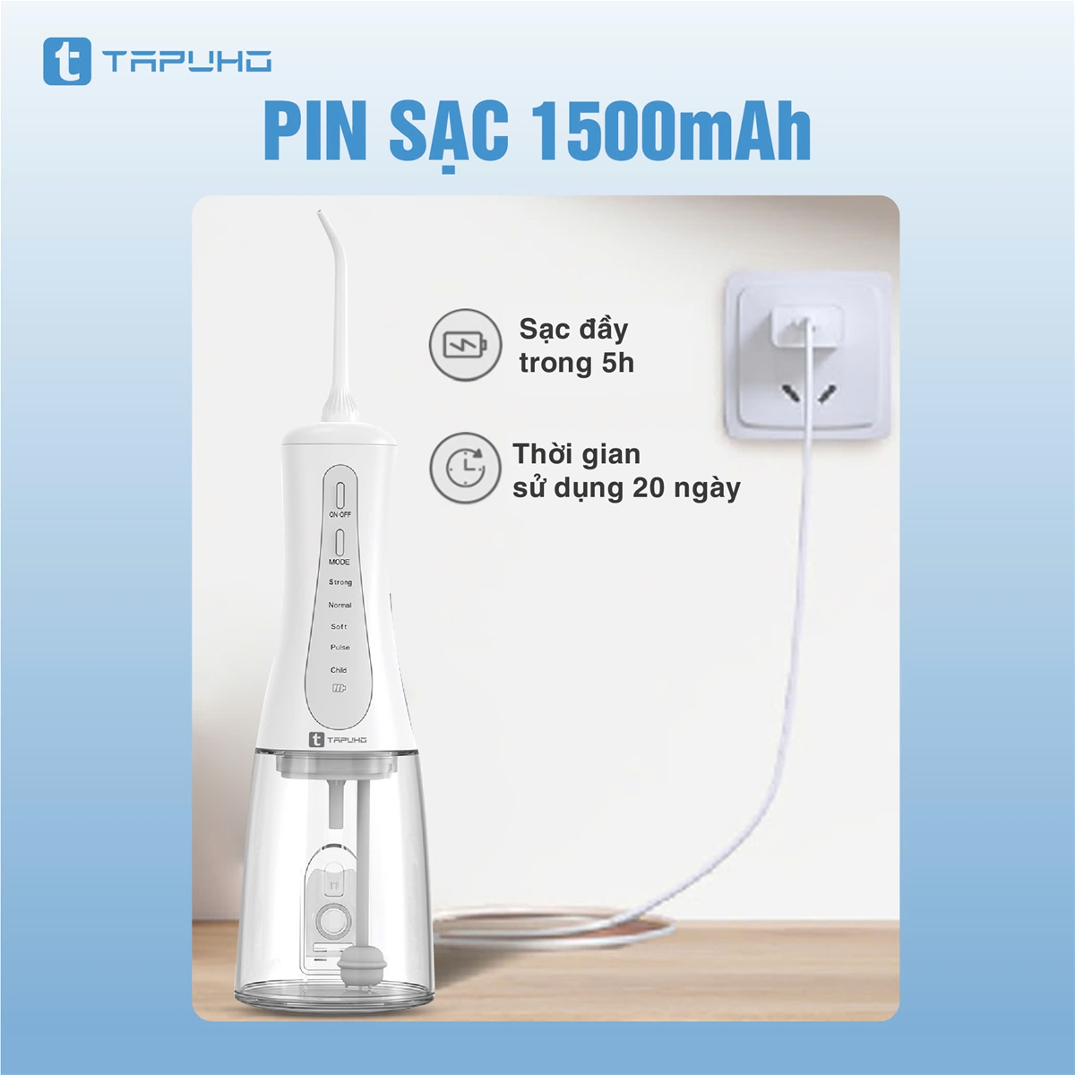 Dung lượng pin lớn: Tăm nước TAPUHO TWT2024 được trang bị pin Lithium lên đến 1500mAh, sử dụng cổng sạc USB type-C, sử dụng thoái mái trong các chuyến đi công tác, du lịch dài ngày mà không cần phải lo lắng