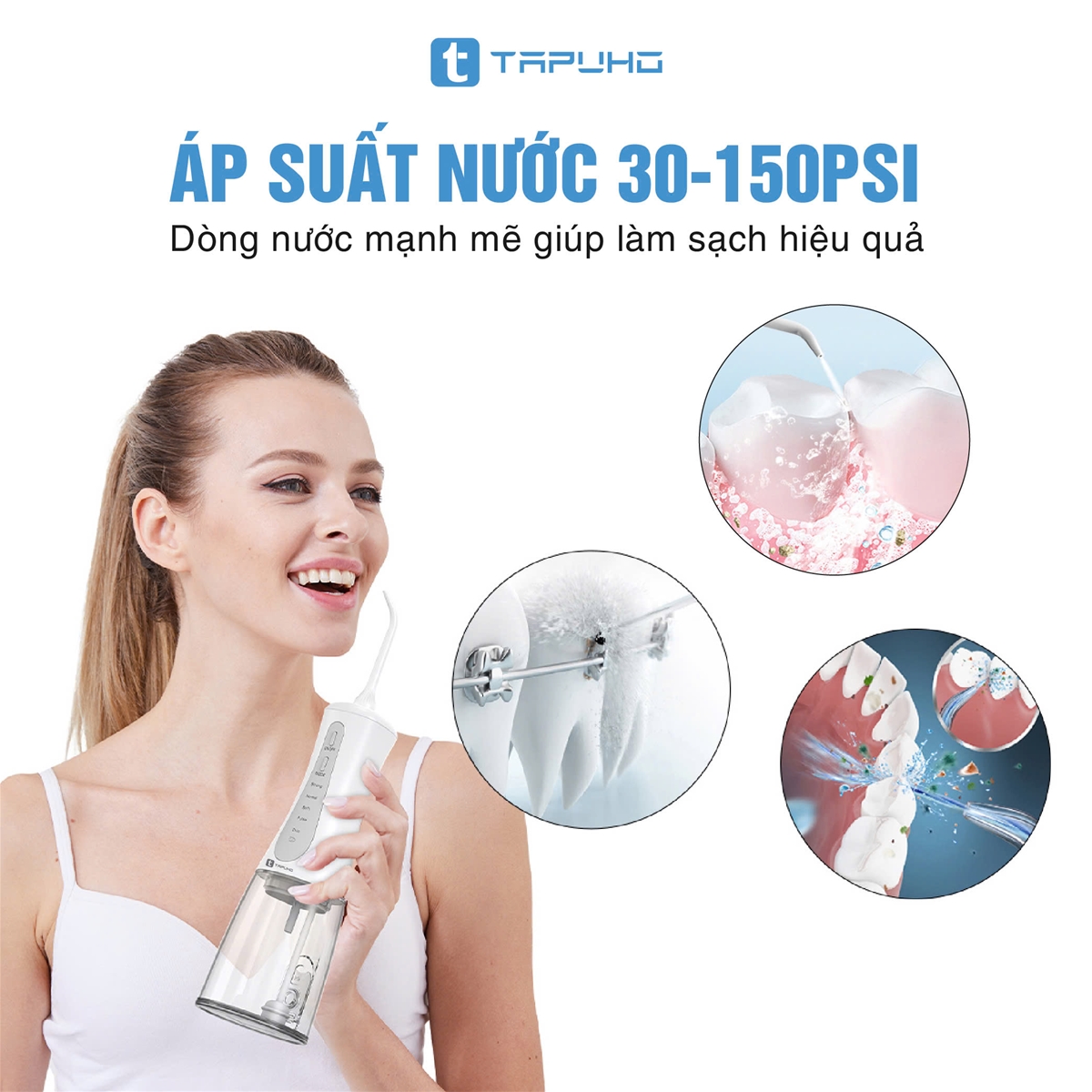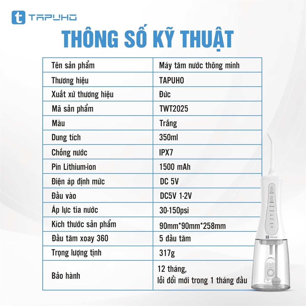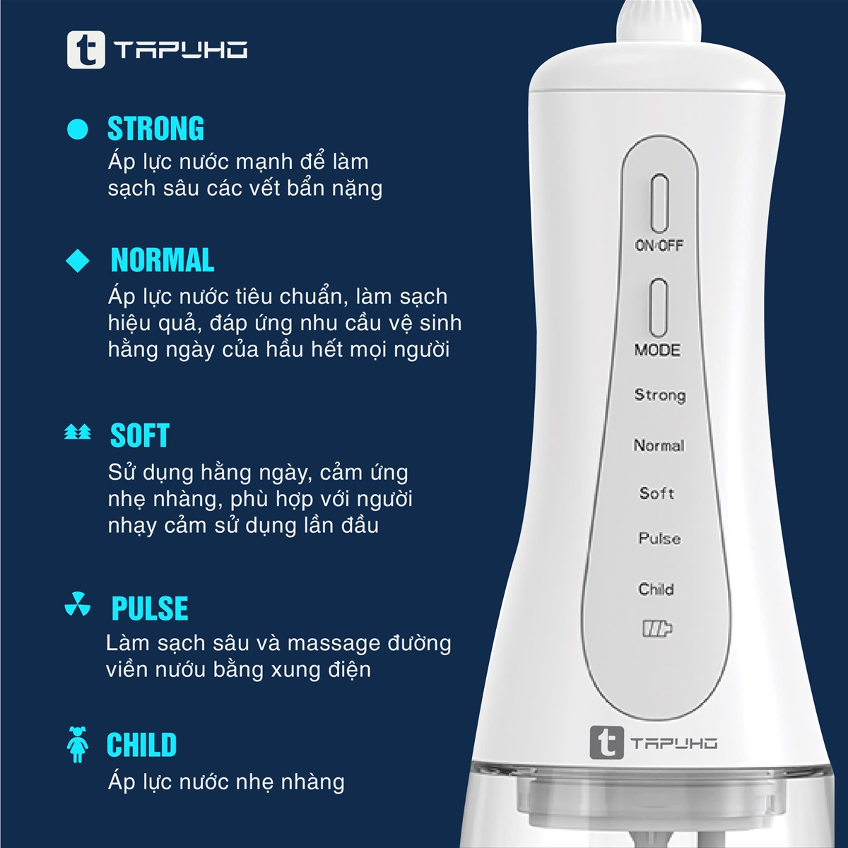 Chế độ đa dạng: Tăm nước TAPUHO TWT2025 gồm 5 chế độ tương đương với 5 áp lực nước khác nhau, phù hợp nhiều độ tuổi từ trẻ em đến người lớn và các đối tượng có nhu cầu sử dụng khác nhau: